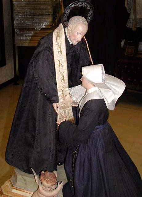 Vincent de Paul, in cloth cassock and stole; kneeling Sister, in 19th-20th century Daughter of Charity blue habit, Spanish cornette. Original in Daughter of Charity provincial house museum, Zaragoza.