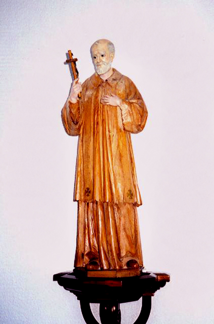 Wooden statue (mostly unpainted), contemplates crucifix in his hands. Original in Daughters of Charity museum, Zaragoza