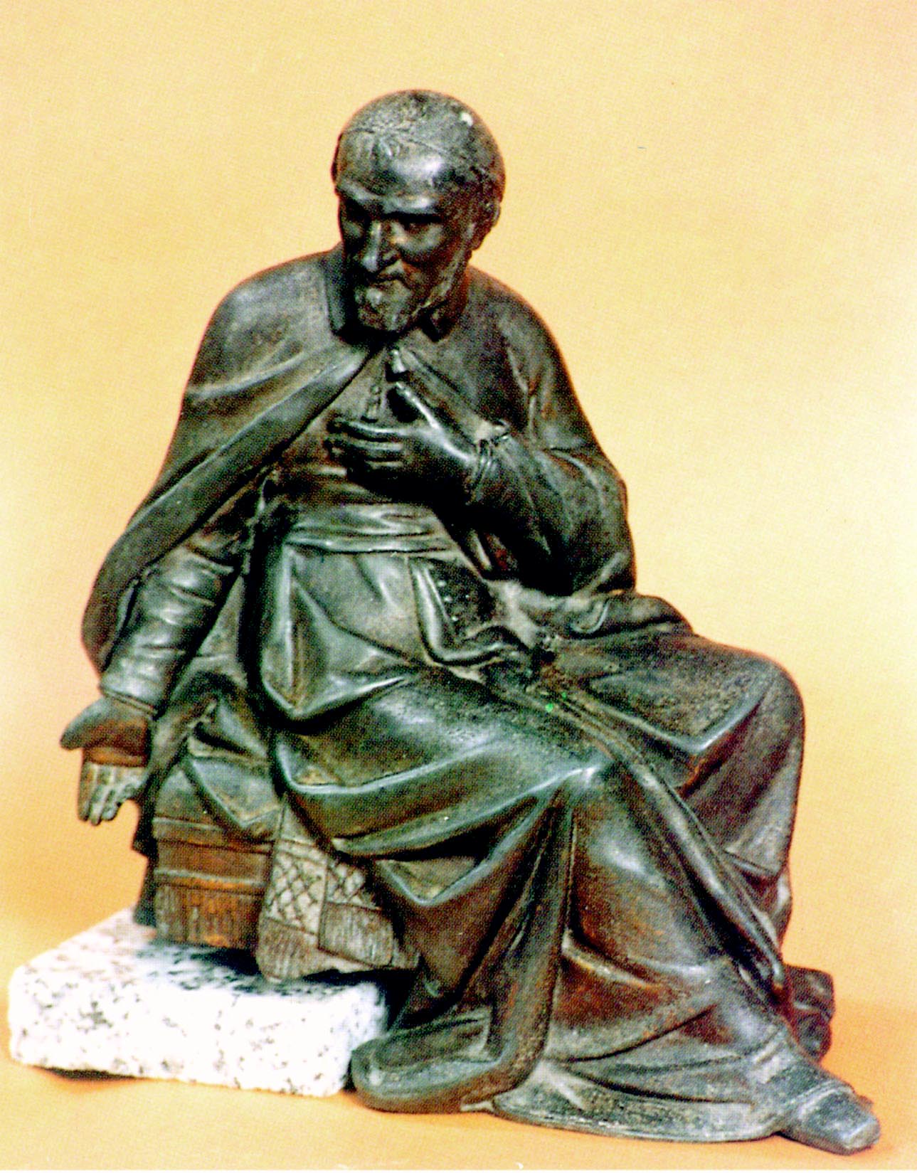 Bronze; Vincent de Paul seated on stool, cassock, cape, skullcap; original in Daughters of Charity house, Villaobispo de la Regueras (León)