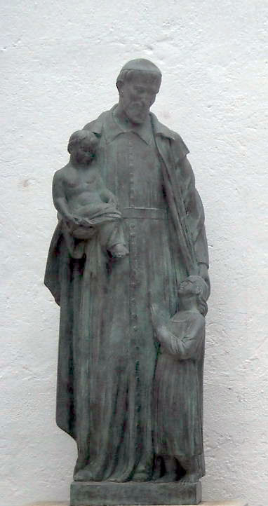 Vincent de Paul standing, cassock, cincture, mantle, skullcap; two children; in Figueres, in a plaza named after him, near Vincentian house.