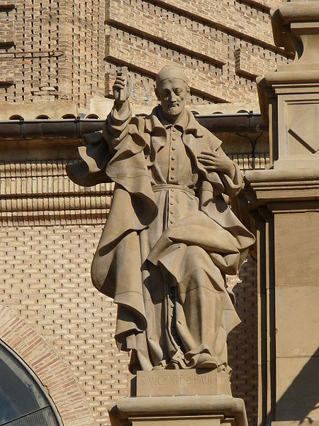 Stone statue, Vincent de Paul, standing, cassock, cincture, mantle, skullcap, holding cross; at shrine of El Pilar in Zaragoza