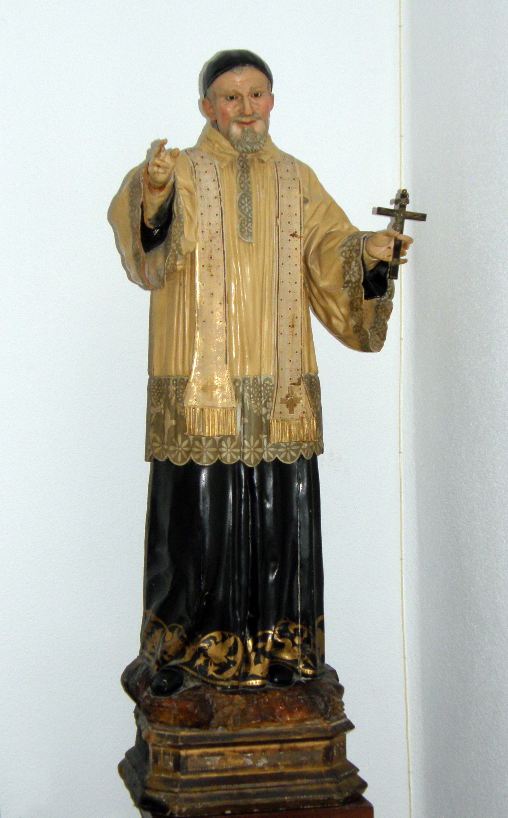 Painted statue, Vincent de Paul, chubby, smiling, standing, black cassock with gilded edge and pattern, surplice, stole, skullcap, holding metal and wood vow crucifix