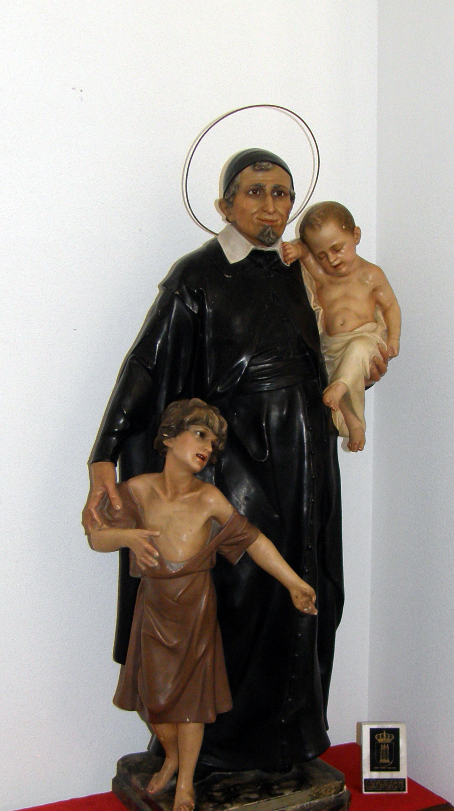 Vincent de Paul, standing, cassock, cincture, mantle, skullcap, metal halo; two childen (infant with athletic muscles); artist, Bro. Ricardo Segundo, 1930, an adaptation of French models; original in Daughters of Charity mother house, San Vicente, Madrid