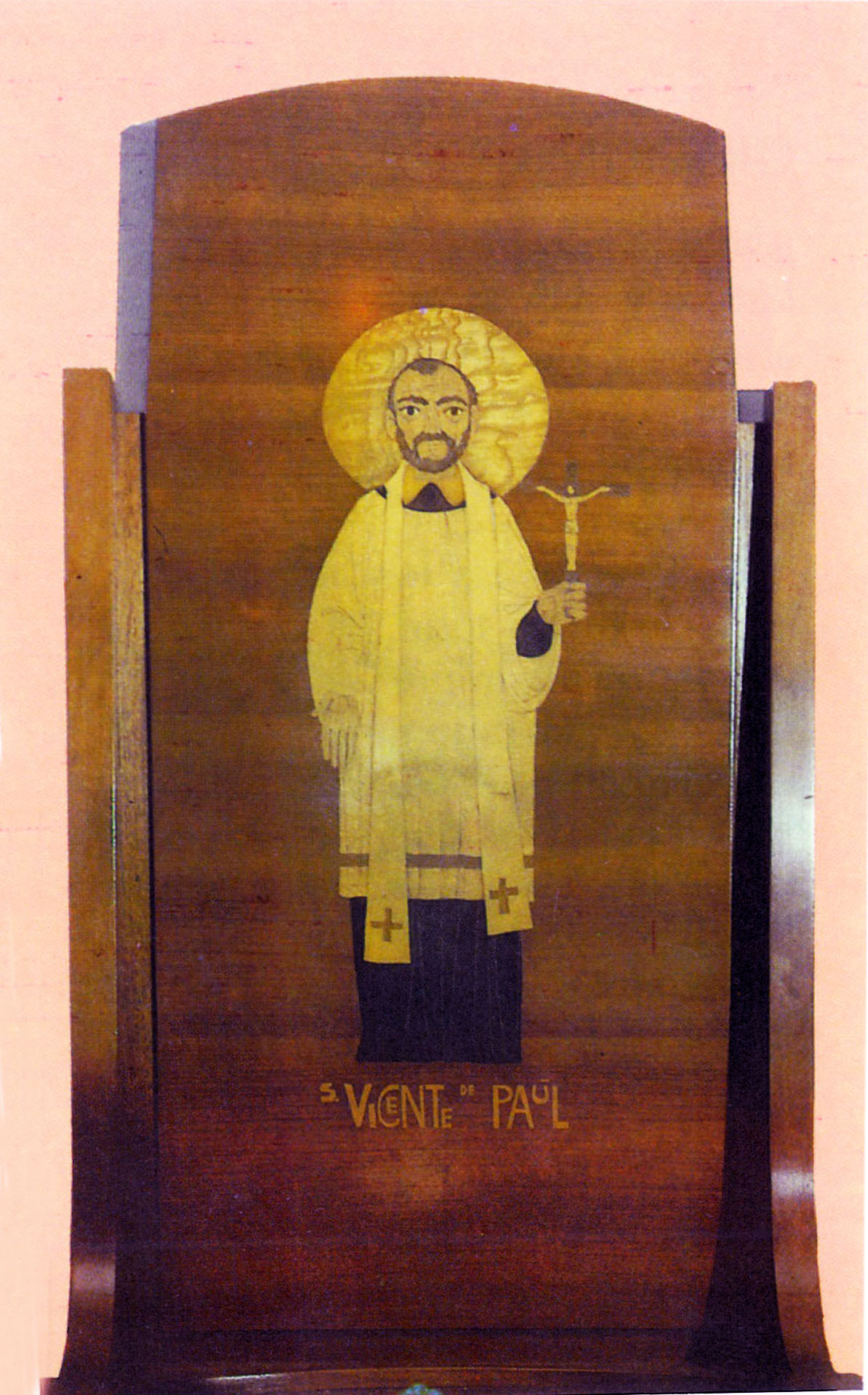 Chair back in marquetry; Vincent de Paul, standing, cassock, surplice, stole, halo, holding crucifix; work of Rabentós, 1973; original in SVdPaul parish, Madrid; [Orcajo, 25]