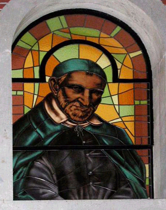 Vincent de Paul, dark face; bust; wearing cassock and cloak; original in Vincentian seminary chapel, Salamanca.