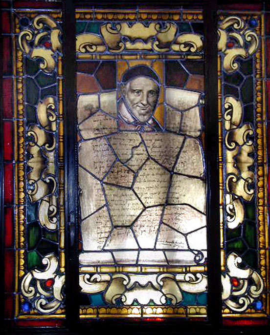 Portrait head of Vincent de Paul above model of original letter. Original in Daughters of Charity provincial house, Zaragoza, along with original letter.