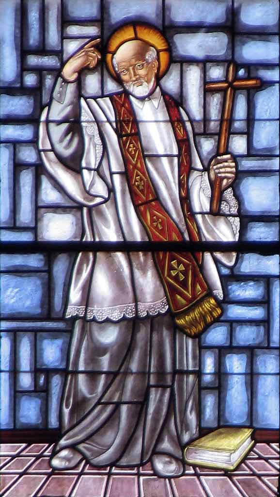 Vincent de Paul, standing, cassock, surplice, stole, halo, carrying cross, book at his feet; based on Bracci statue in St. Peter's, Vatican City; internet image; in cathedral of Xativa (Valencia)