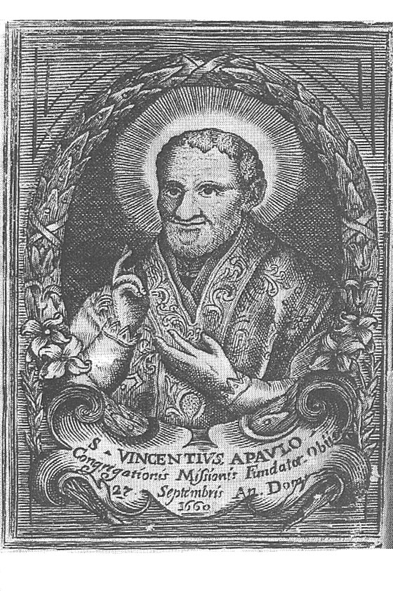 Frontispiece engraving for Diario, no date; Latin text, Saint Vincent de Paul (hence after 1737); Vincent de Paul, cassock, surplice, mass vestments, blessing; halo; Latin text