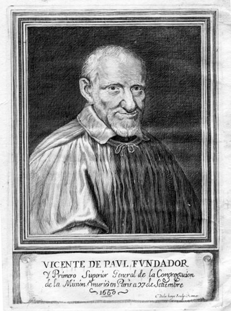 Engraving, 1701; Vincent de Paul in cassock, surplice (Moutiers St. Jean model); Spanish text, in biography of 1701