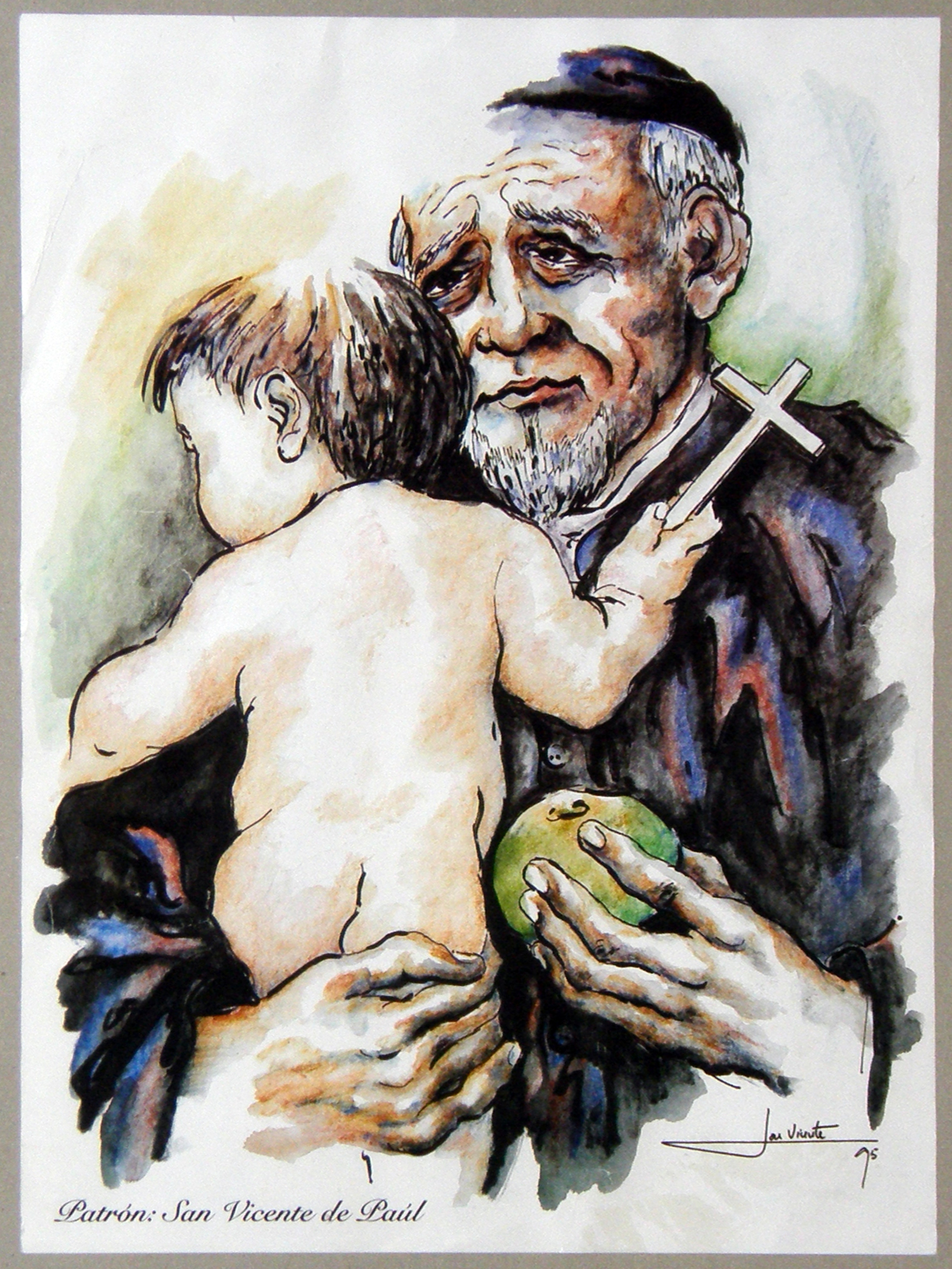 Vincent de Paul, with child holding cross; Watercolor, dated 1995; original in provincial offices, province of Zaragoza; unsigned
