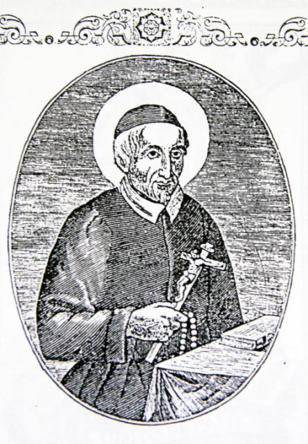 Page of prayers; Vincent de Paul with crucifix, rosary, book; original in archives, German province, Trier;
