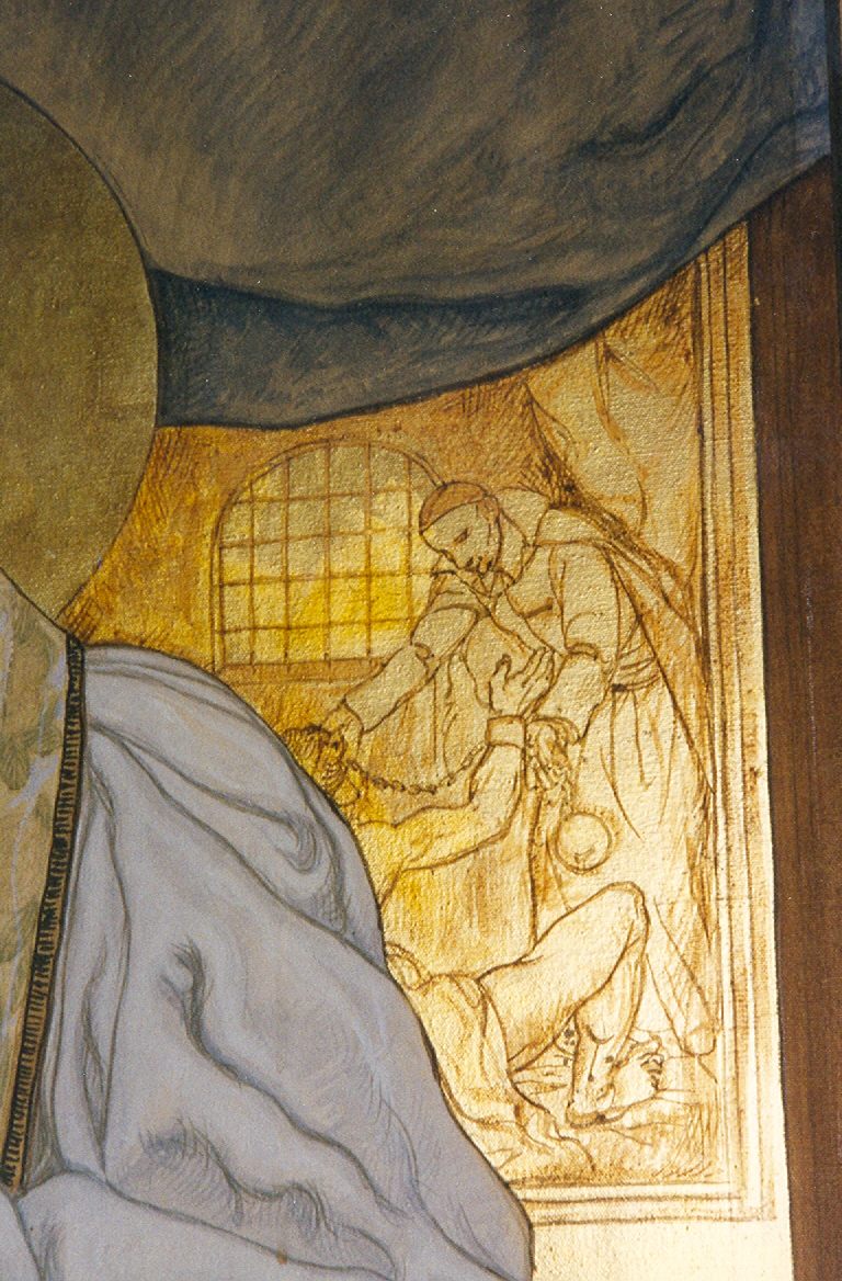 Detail of Vincent de Paul preaching; Vincent de Paul taking chains of a galley convict; original in DePaul Center, Montebello