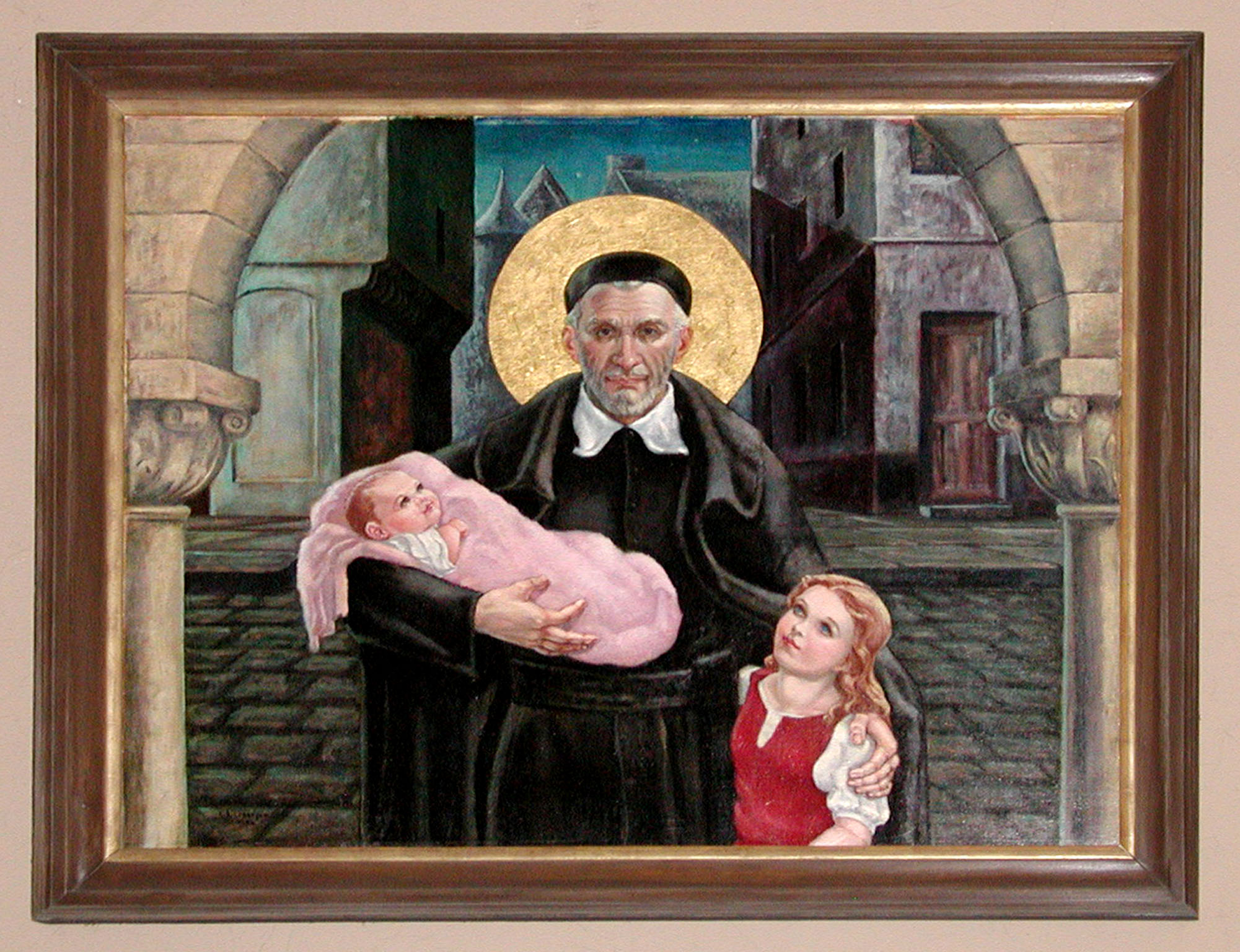 Framed oil painting; Vincent de Paul with two children, one in pink blanket; gilded halo; standing in archway. Original in Vincentian Residence, St. John's University, Jamaica; moved to St. Vincent's Seminary, Germantown, PA