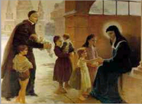 Painting, Vincent de Paul presents children to care of Louise de Marillac; church in background, snow; internet image; Original in Society of St. Vincent de Paul, Boston