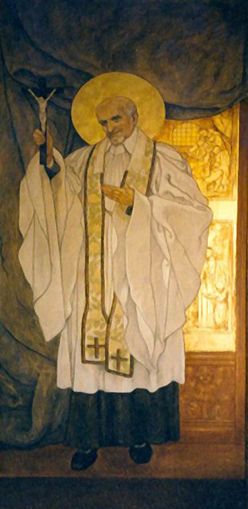 Oil painting with gilding; Vincent de Paul in ample surplice, white stole, gestures to crucifix; other scenes behind; original in DePaul Center, Montebello