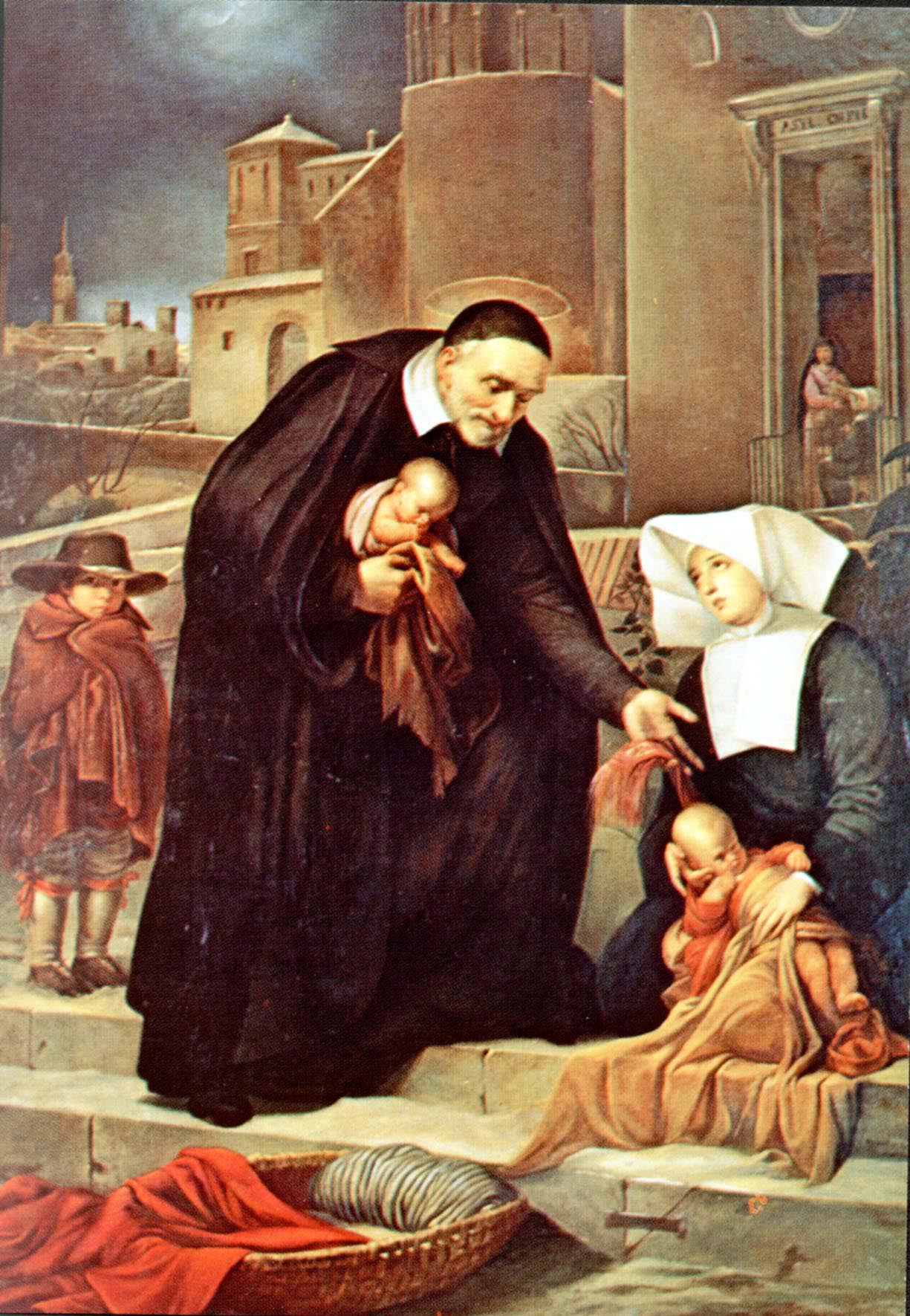 Oil painting, Vincent de Paul gives foundlings to Daughter of Charity; other figures and buildings in background; artist, P. Gagliardi; original in provincial house, Daughters of Charity, Emmitsburg