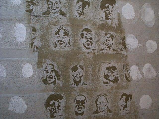 Outdoor mural, detail of faces (made with rubber stamps), composing head of Vincent de Paul; DePaul University; artist, Mark Elder, CM, with students