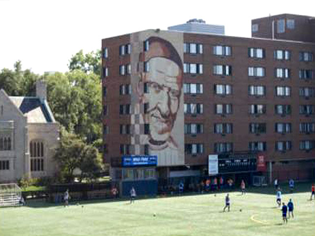 Outdoor mural, Vincent de Paul, overlooking Wish Field, DePaul University, Chicago; artist, Mark Elder, CM, with students