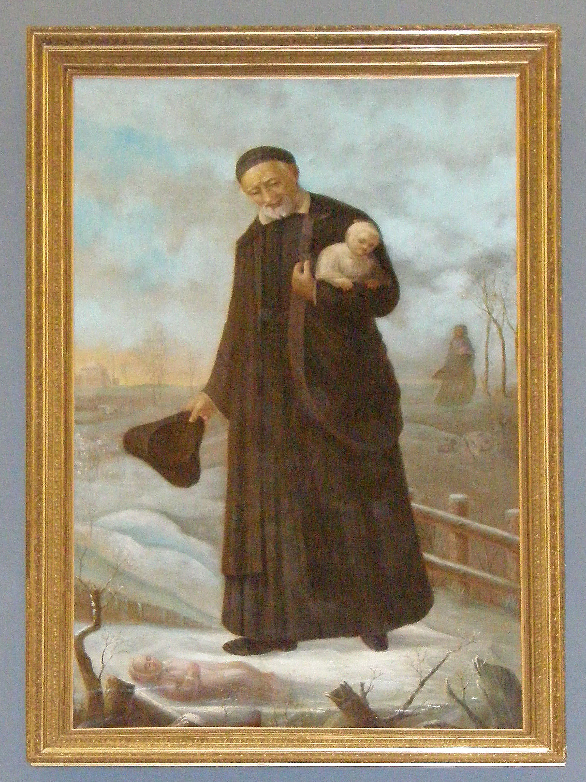 Framed oil on canvas; Vincent de Paul, standing, cassock, mantle, skullcap, holding hat; holding child, another in snow; woman in background of rural scene; original at DePaul University, American artist, 19th century