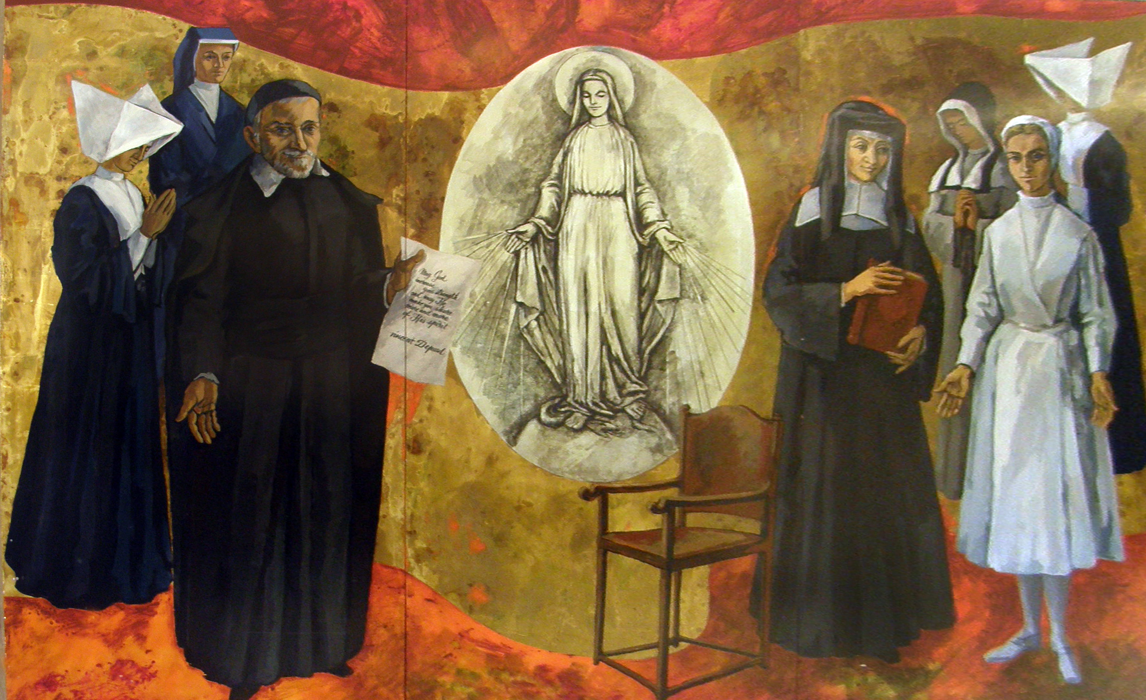 Vincent de Paul, Louise de Marillac, Daughters of Charity in various habits, Our Lady of Miraculous Medal, director's chair in foreground; original in St. Vincent's Hospital chapel