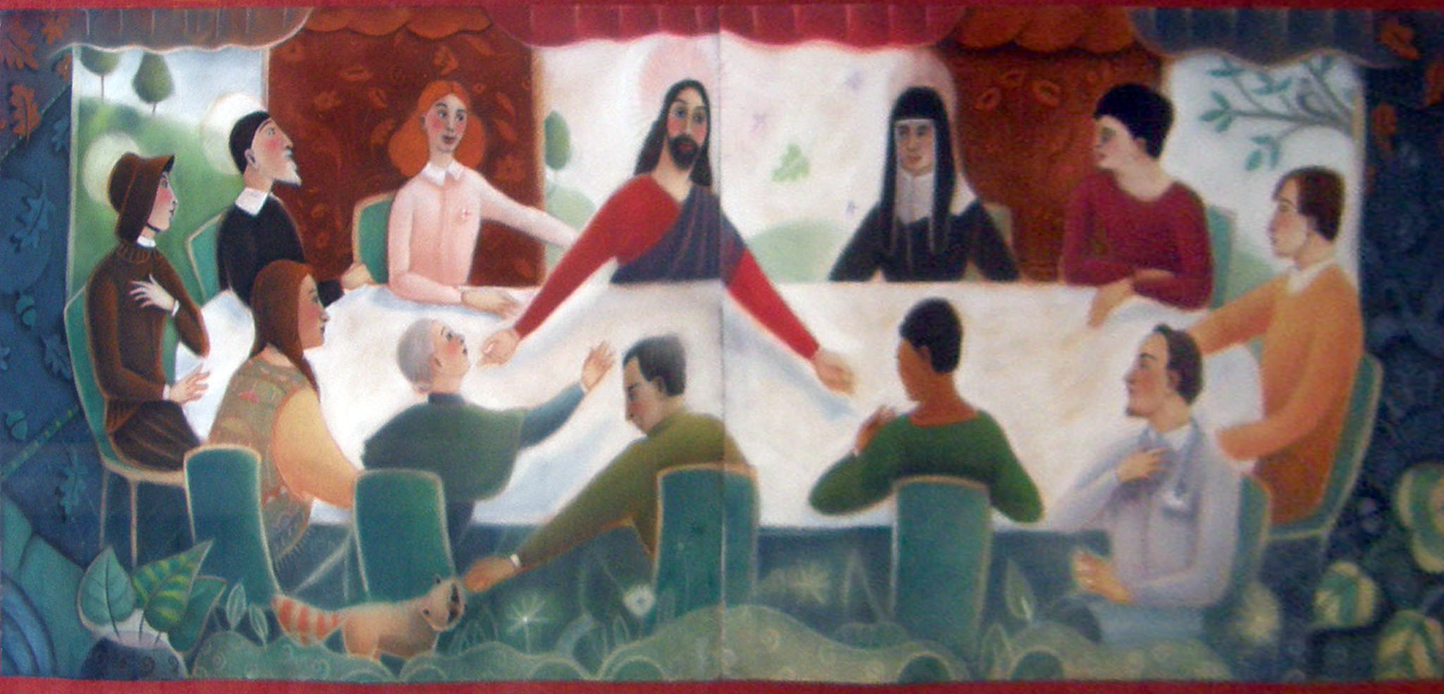 Based on Graz tritypch and others; twelve figures, including Jesus, seated around table; one man reaches out to a light colored racoon (similar to the dog in the Graz painting); the saints shown with halos; original at St. Vincent Hospital, Indianapolis