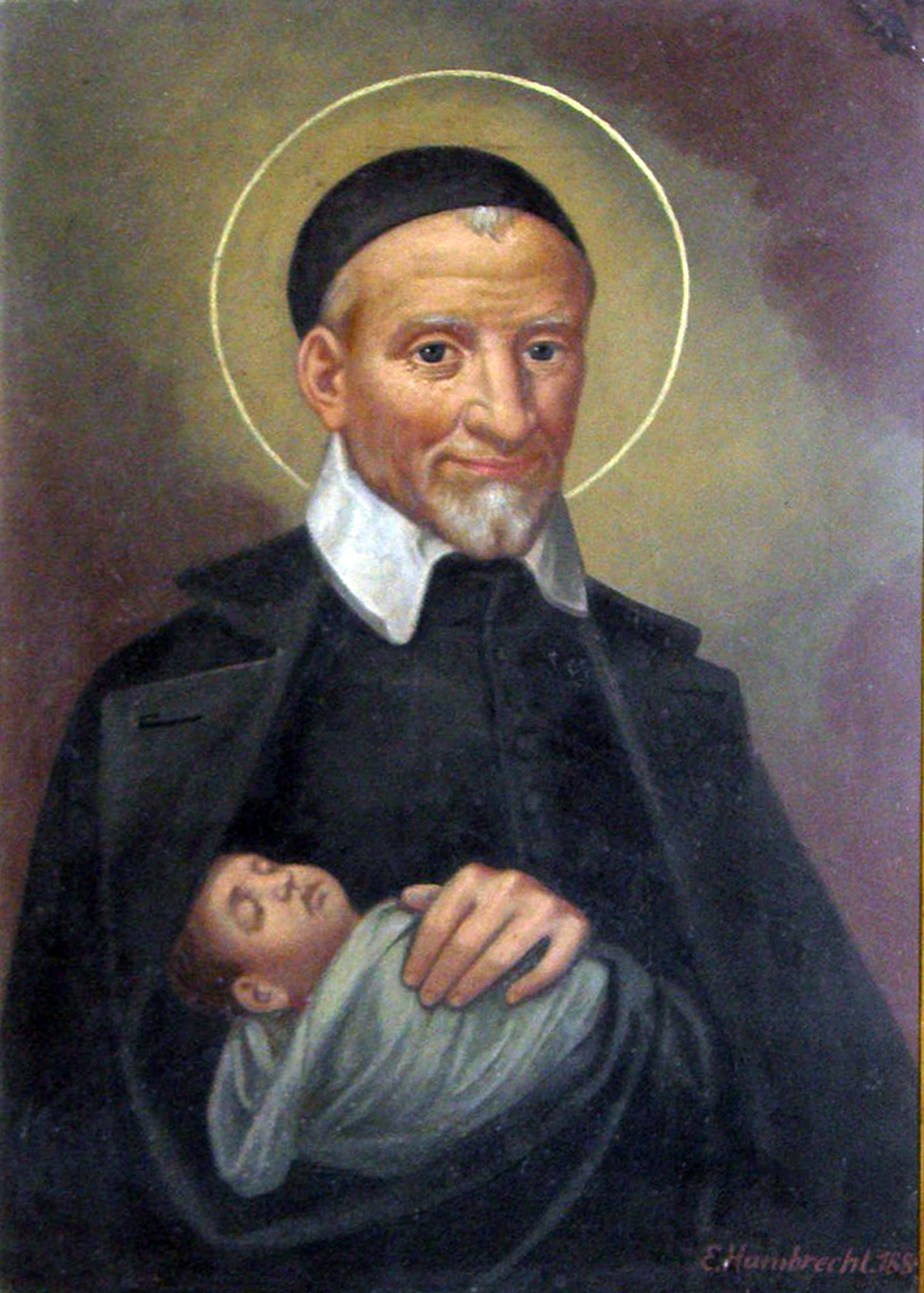 Vincent de Paul, standing, cassock, overcoat or cape with lapels; skullcap, halo; holding child; by Humbrecht, 188(5); in Kevin Fausz CM collection; painted on tin