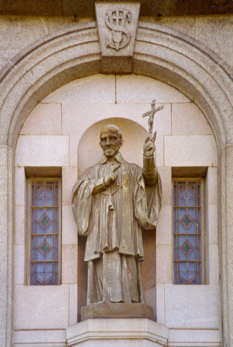 Stone statue, Vincent de Paul, standing, cassock, surplice, stole, skullcap, gesturing toward crucifix; original at entry, Vincentian provincial house, Germantown
