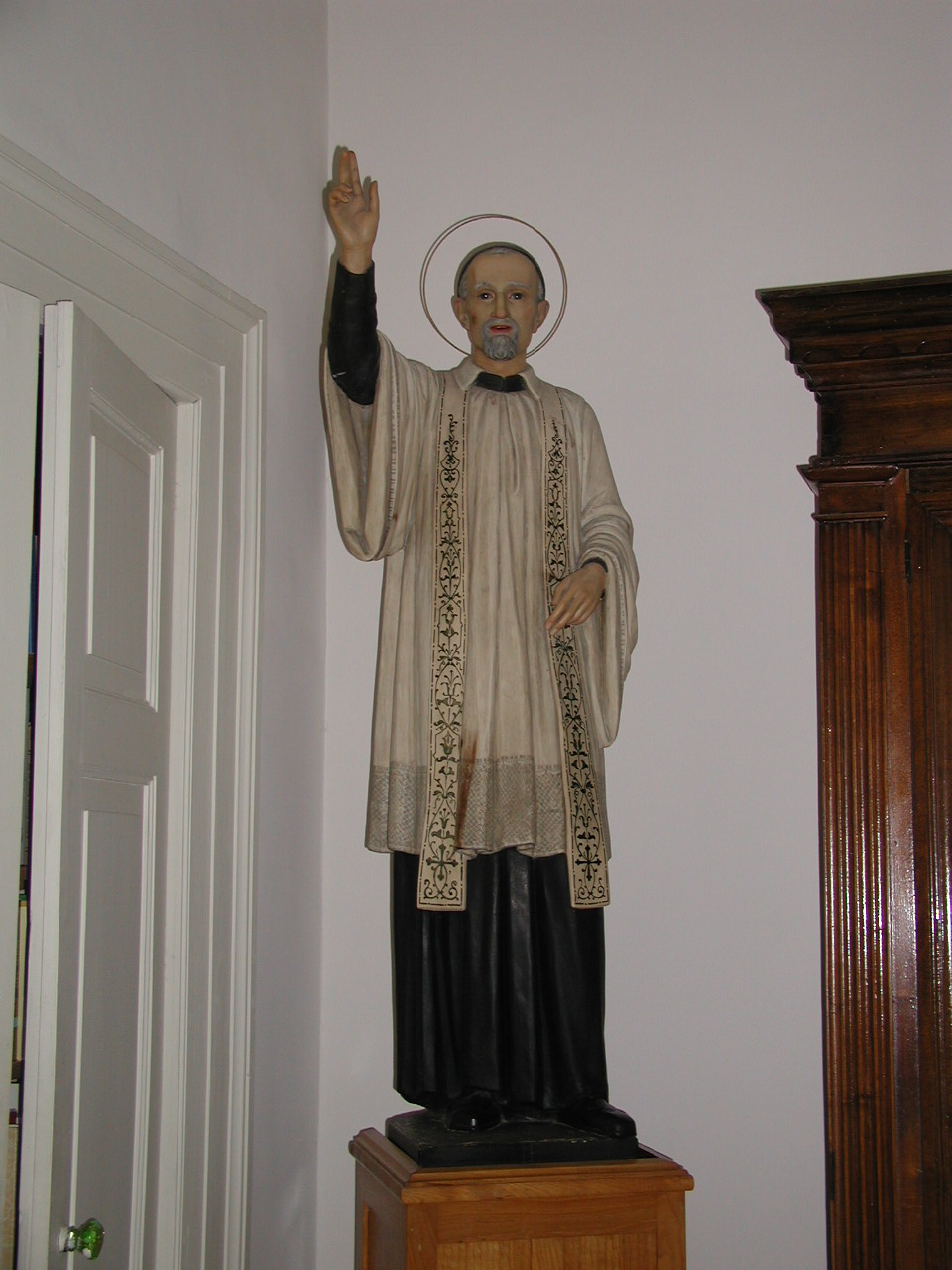 Painted statue, Vincent de Paul, standing, cassock, surplice, stole, skullcap, metal halo, hand raised in blessing; original in archives, provincial house, Germantown