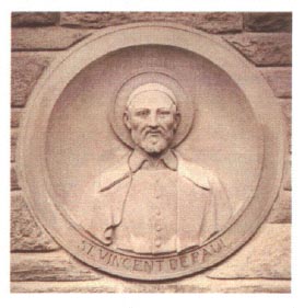 Carved relief, bust of Vincent de Paul, cassock, cape, skullcap, halo, name below; at Vincentian provincial house, Germantown