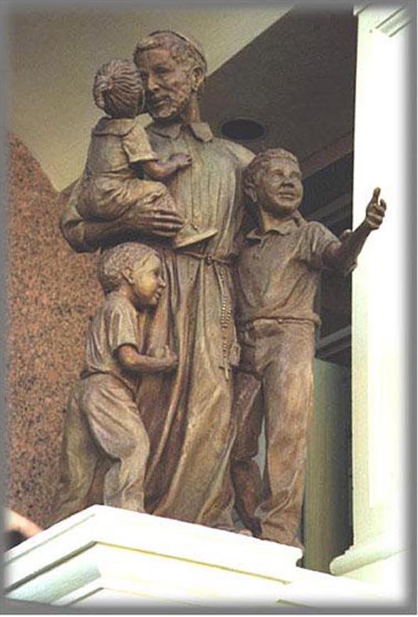Publicity photograph, Vincent de Paul, standing, cassock, rosary, sleeves turned back; with three children; internet image, may be copyrighted