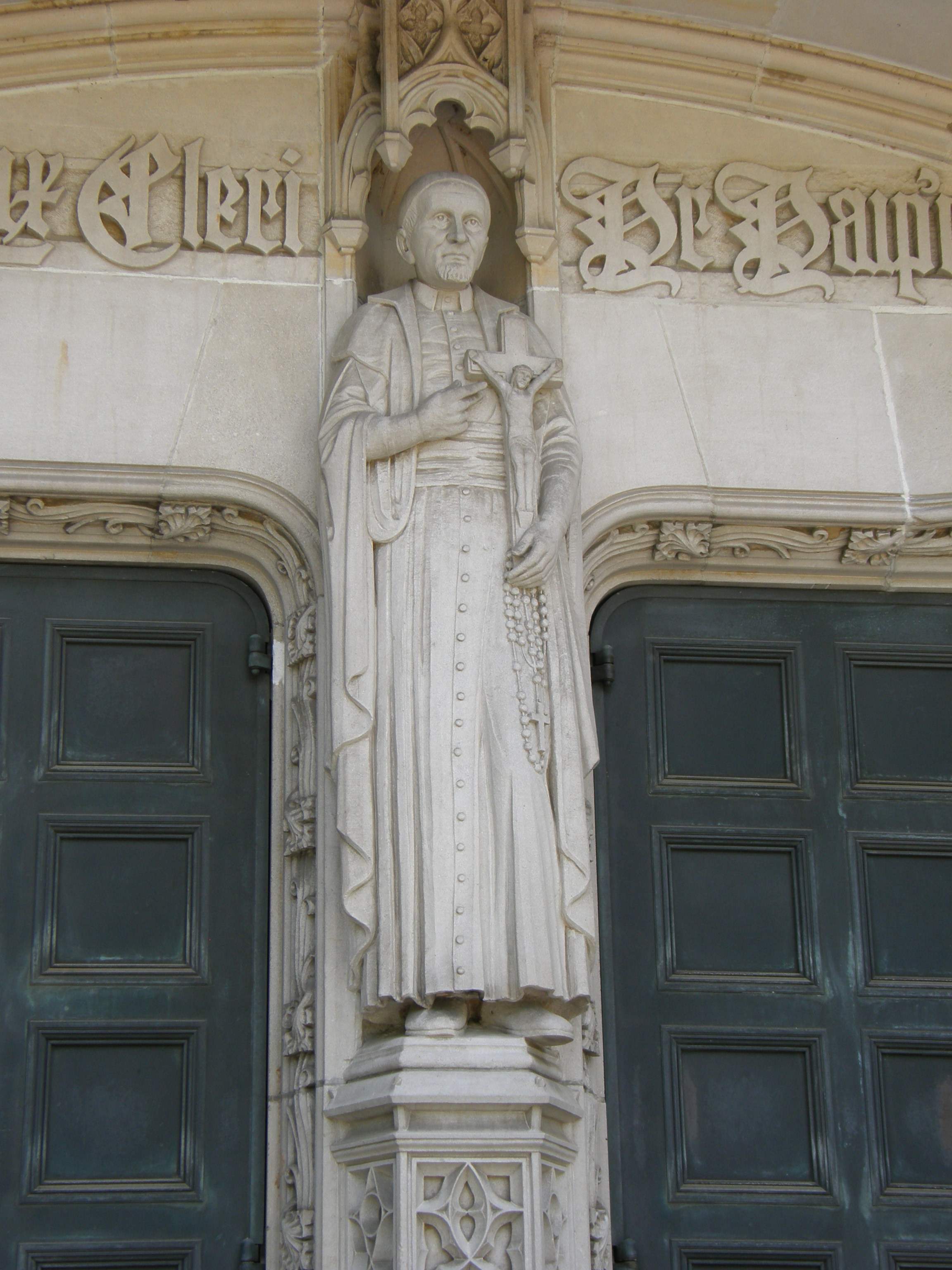 Statue at chapel entry, Vincent de Paul, standing, cassock, cape, skullcap, gesturing to crucifix, wearing rosary; at St. Joseph's Seminary, Princeton