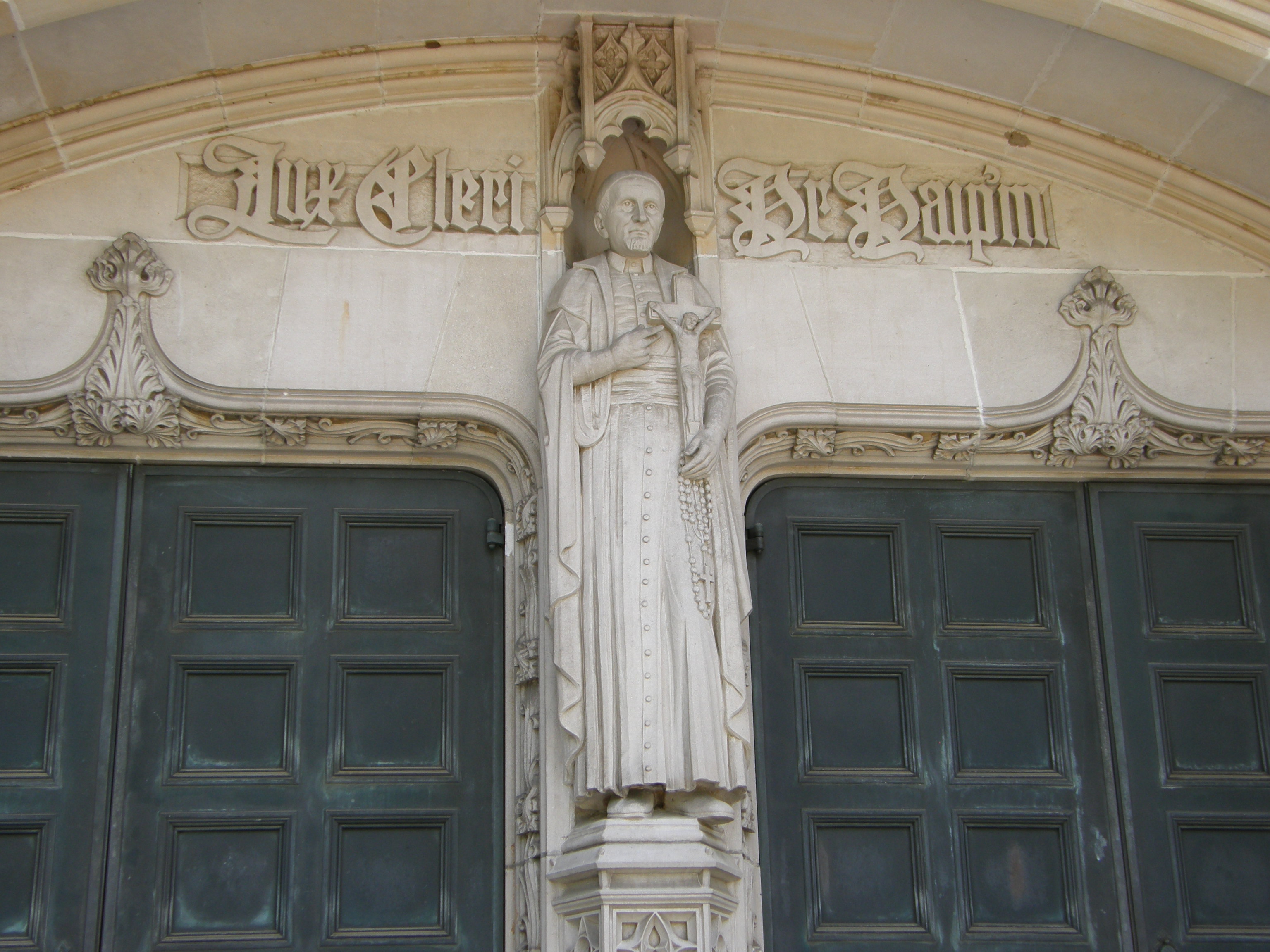 Full view of entry to chapel, Vincent de Paul with crucifix, rosary; Latin inscriptions (abbreviated: Pr Paup'm, Pater Pauperum); original at St. Joseph's Seminary, Princeton