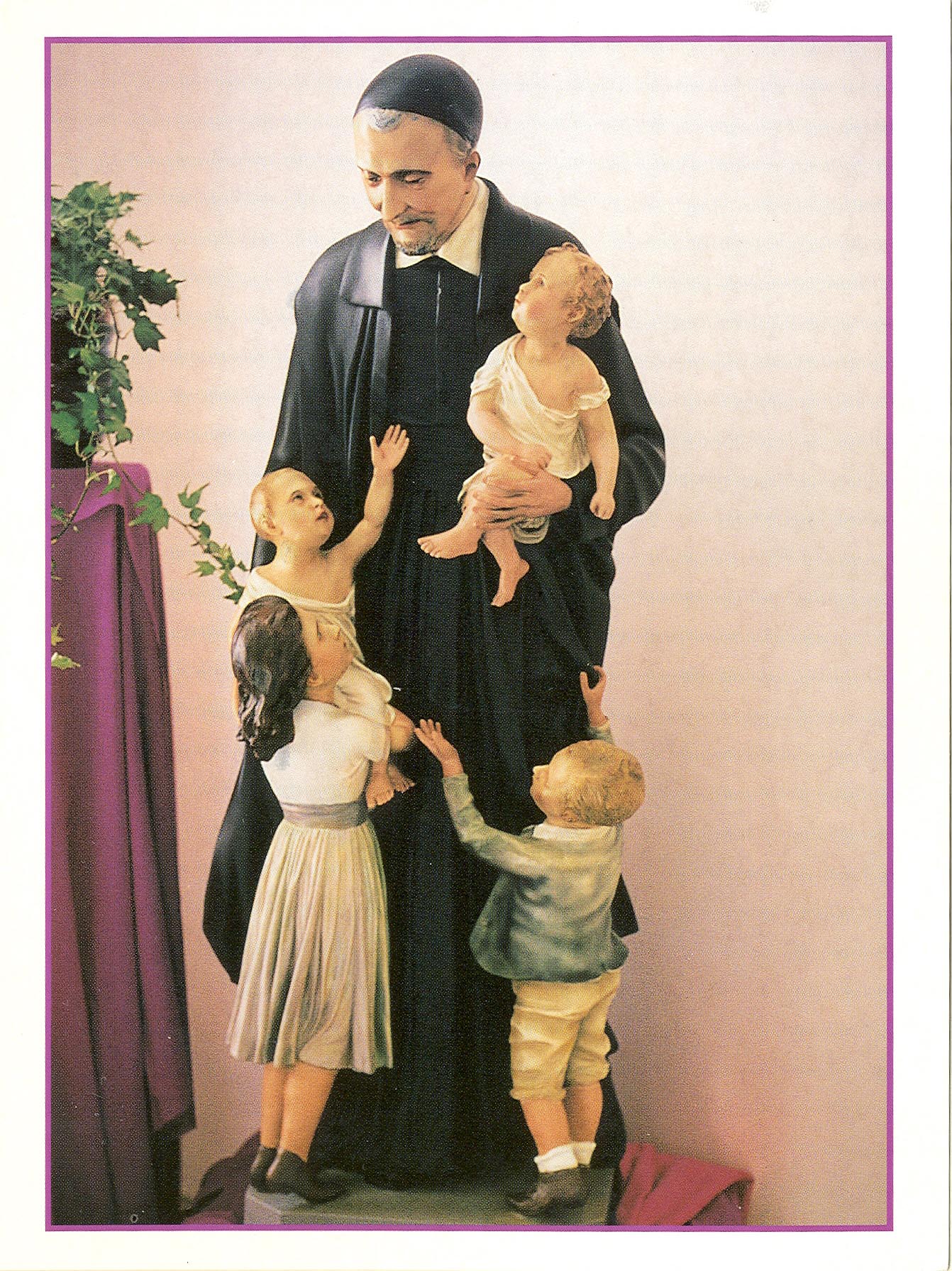 Photograph of statue group, VIncent de Paul standing, cassock, cincture, mantle, skullcap, with four children; location of original unknown; Leo Keigher collection