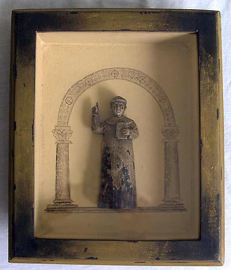 Painted wood in box frame; Vincent de Paul, standing, cassock, holding book, right hand raised in preaching gesture; internet image