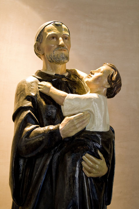 Vincent de Paul, standing, cassock, mantle, skullcap; holding boy in his cloak; by Patty Ledezma, Sonrisainternet image, may be copyrighted