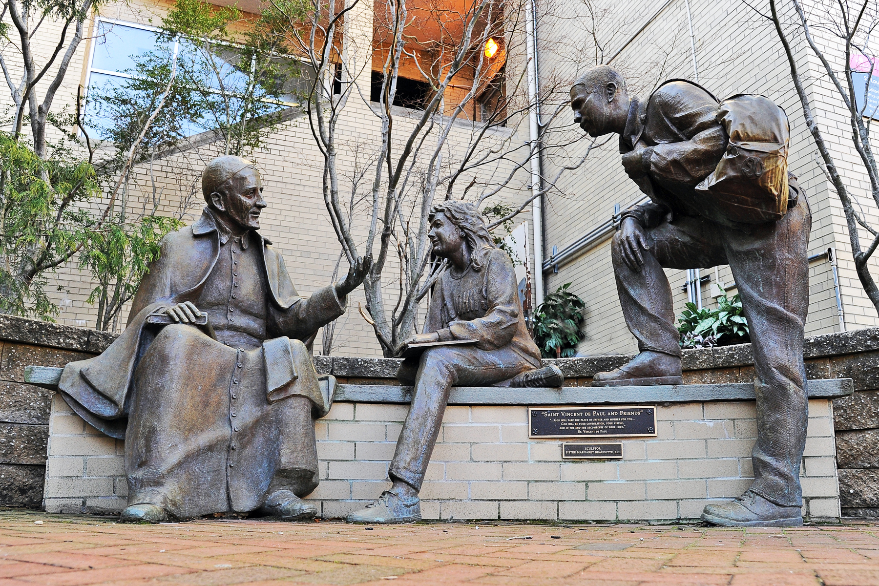 Bronze; artist: Sr. Margaret Beaudette, SC, 1996; similar to statues in Chicago (DePaul University) and Niagara University; also Manila