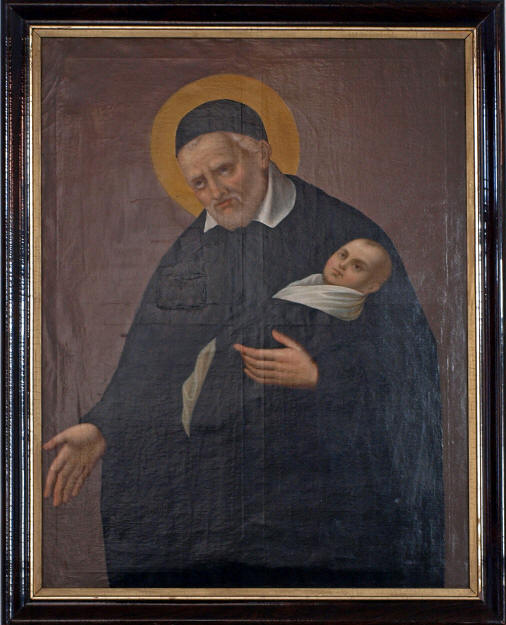 Vincent de Paul, standing, cassock, cape, skullcap, halo, holding child; internet image