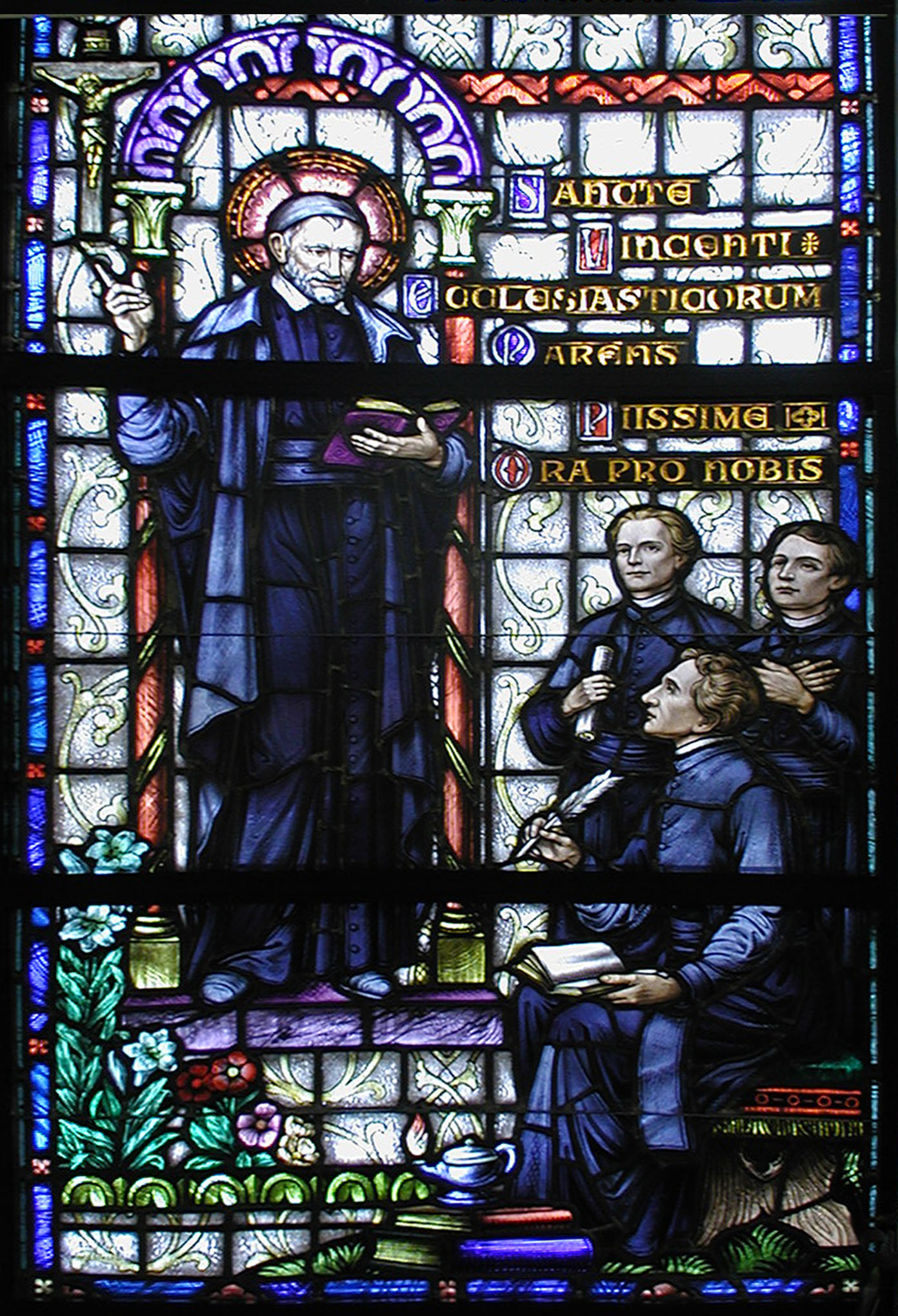VdP , standing under arch, with three priests. Text from litany: SV , Father of the Clergy, pray for us. Original in chapel, St. John's University, Jamaica, NY; transferred from earlier chapels