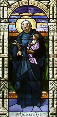 Vincent de Paul holding infant, contemplating crucifix. Polish title below. Internet image; original in parish, Dickson City, PA.