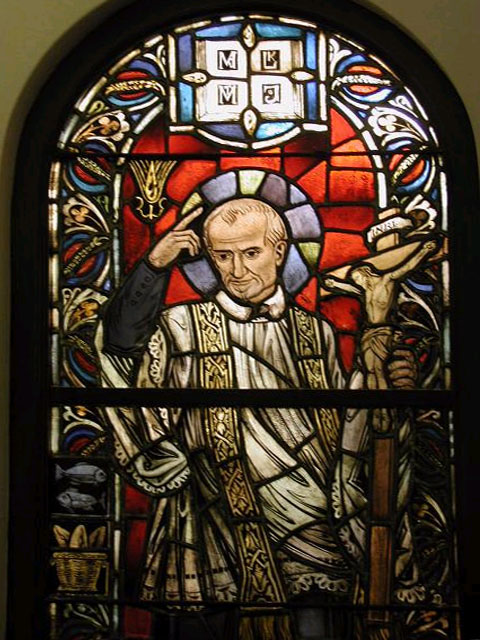 Vincent de Paul, based on Bracci statue, Vatican; Eucharistic symbols (bread, fish, grapes, wheat); initials of evangelists above. Formerly, St. Thomas Seminary, Denver; moved to Vincentian residence, St. Louis.