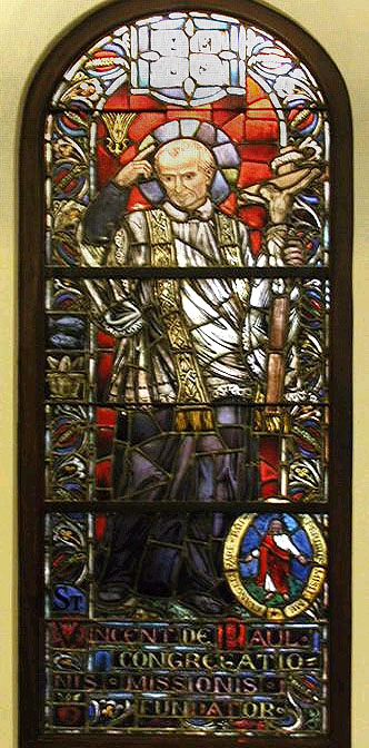 Vincent de Paul with crucifix, emblem and motto of Congregation below; Latin text: "Vincent de Paul, founder of the Congregation of the Mission." Original in CM house, Saint Louis.