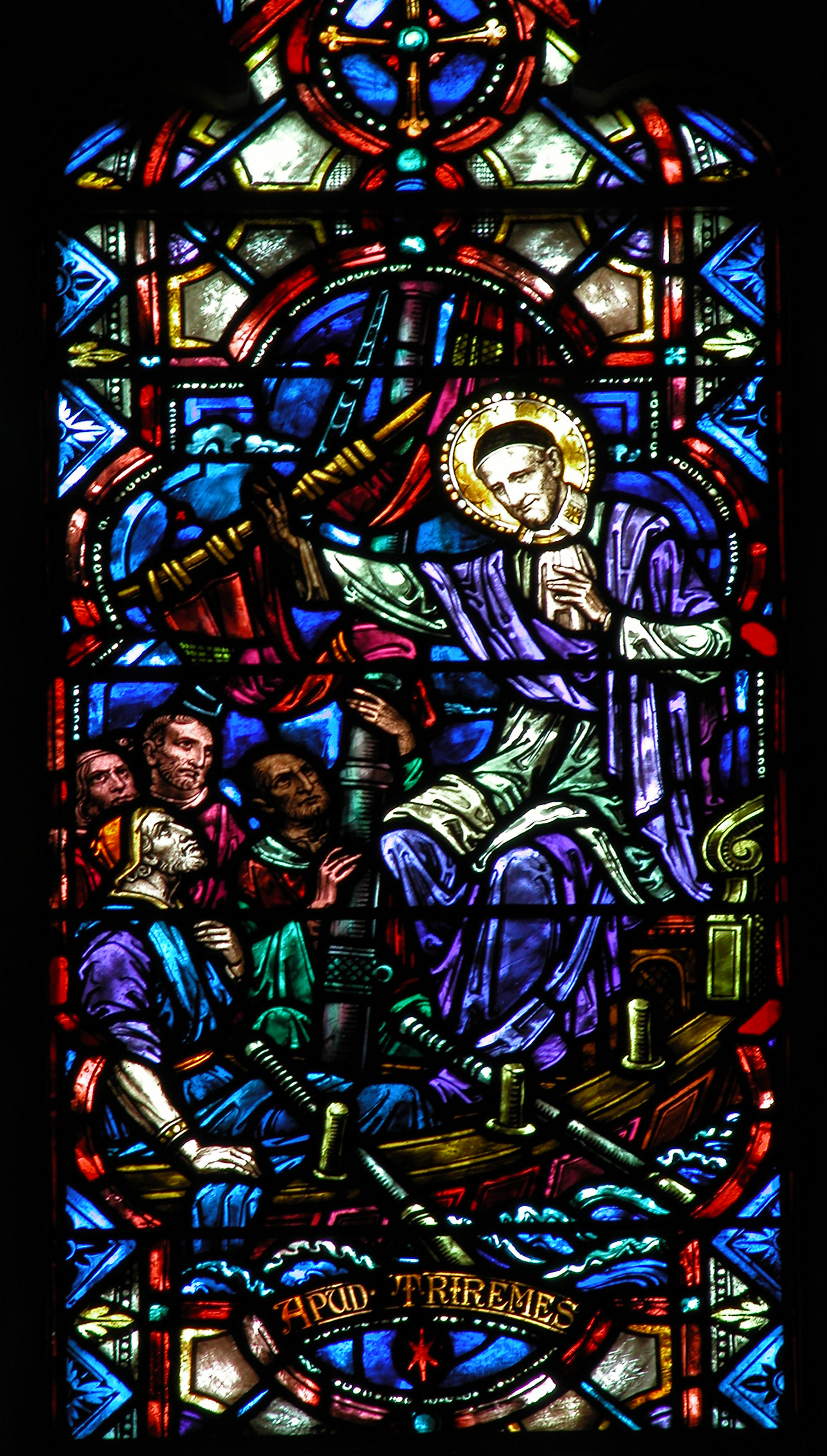 Vincent de Paul, seated, cassock, surplice, skullcap, halo; gesture of teaching, evangelizing galley prisoners on galley; Latin text: On the Galleys. Original in St. Joseph Seminary, Princeton