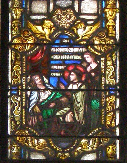 Vincent de Paul, seated, cassock, surplice, skullcap, halo; at deathbed of Louis XIII, queen in background; original in St. Vincent de Paul Church