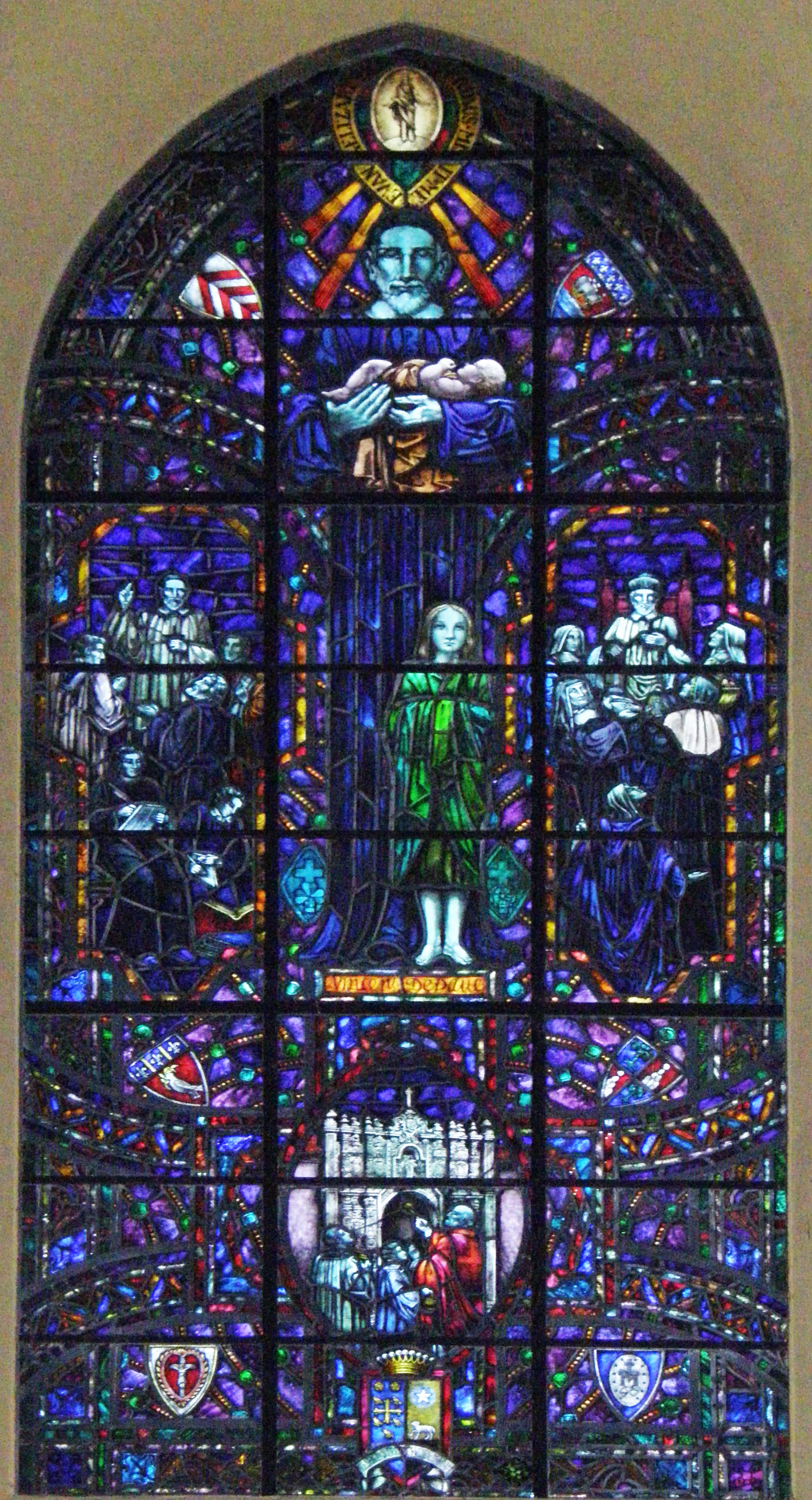 Vincent de Paul, two children, works of Vincentians, preaching and teaching. Seal of Congregation above, seal of Sisters below. Blessing of seminary library. Original, St. John's Seminary, Camarillo