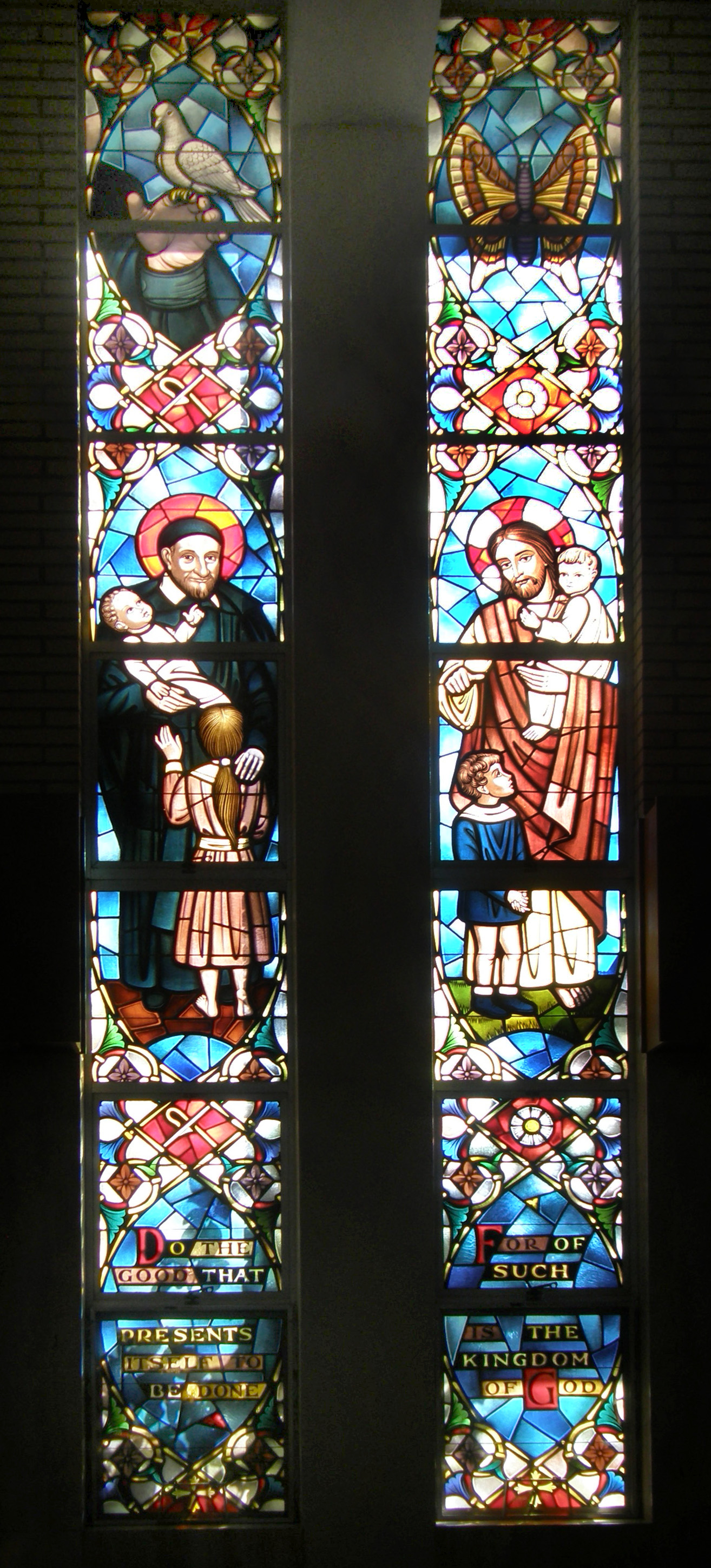 Dual windows, Vincent de Paul and Jesus with children; texts and symbols above and below relating the two figures; original in St. Mary's Seminary, retreat center