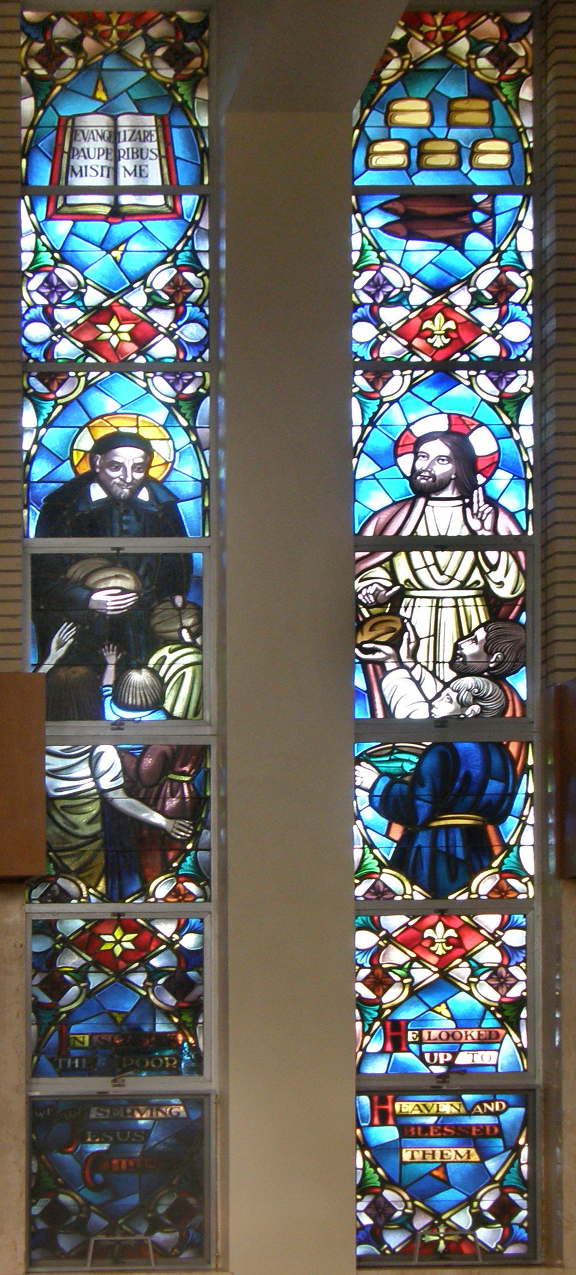 Dual windows; Vincent de Paul, standing, cassock, cape, skullcap, halo, holding loaves of bread; Jesus distributing bread; symbols and texts uniting two subjects; original in St. Mary's Seminary, retreat center