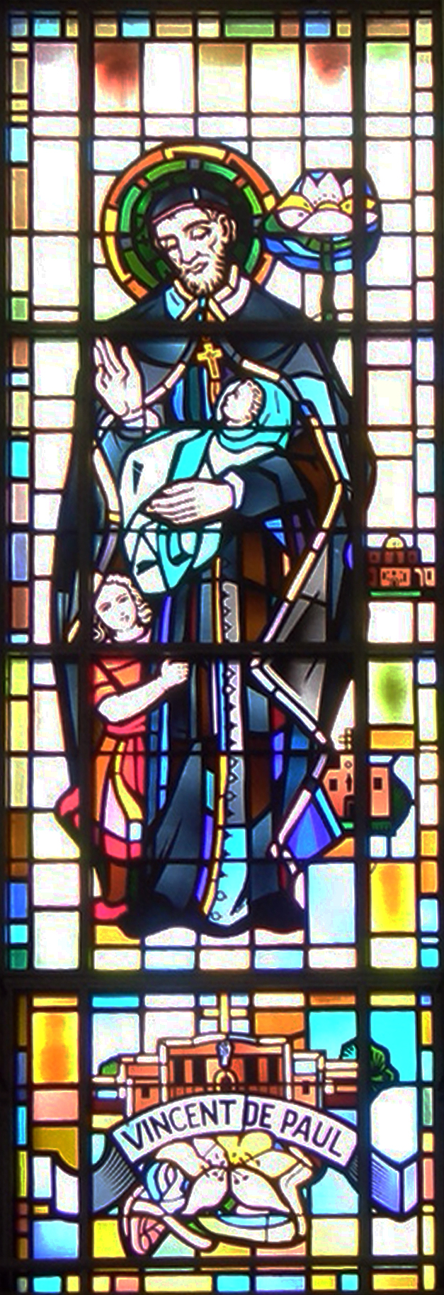 Vincent de Paul, standing, cassock, pectoral cross, cape, skullcap, halo; two children; floral emblems and buildings; in St. Ferdinand parish, Chicago