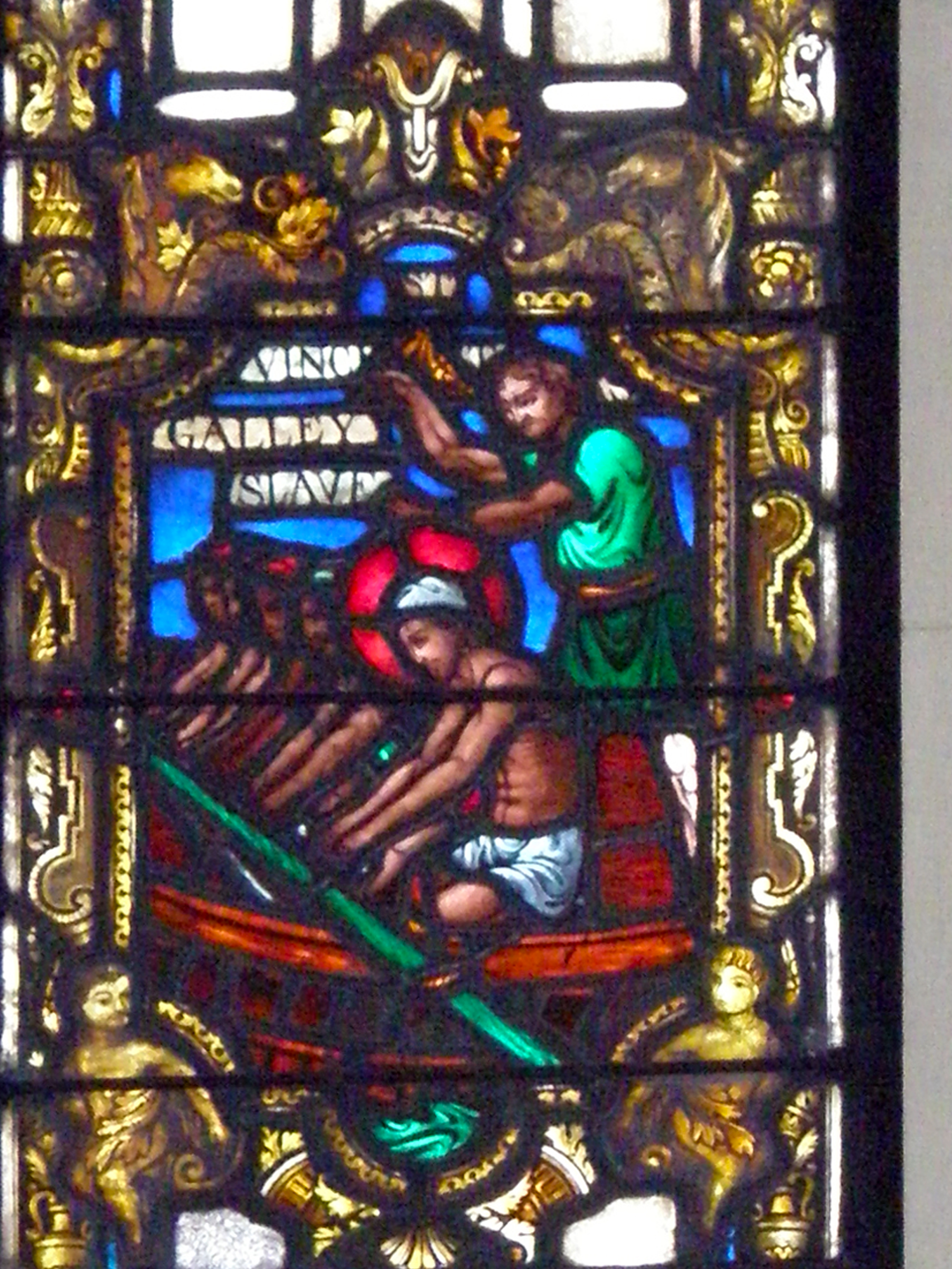 Vincent de Paul, in shorts, white cap, red halo; rowing on a galley; sailor behind in green