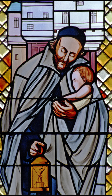 Vincent de Paul, standing, cassock, cape, skullcap; holding lantern, child in his arms; courtesy of Fr. Gene Plaisted, OSC