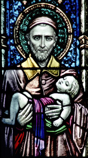 Vincent de Paul, standing, in cassock, skullcap, halo; based on Falguieres statue; courtesy of Fr. Gene Plaisted, OSC